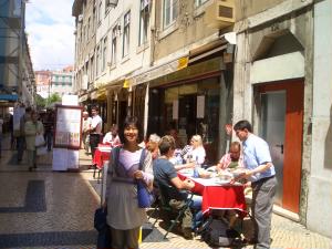 さて、お昼にしましょう。 地下鉄 レスタウラドーレス駅の近くにレストランが集まっています。 なので、私たちは「レストランどうです駅」と呼んでいました。レスタウラドーレス広場近くのレストランは、表に出ているメニューを見ながら歩くと、すぐにレストランの人たちが呼び込みに来ます。 ちと、面倒。。。そこで、メインストリートのアウグスタ通りのレストランで店選び。ここは、声は掛けてきますが、しつこくありません。 メニューはポルトガル語、スペイン語、フランス語、イタリア語、英語の5ヶ国語で書いてあることが多く、旦那様は英語メニューを、私はイタリア語メニューを見で把握するという不思議な夫婦です(笑) |