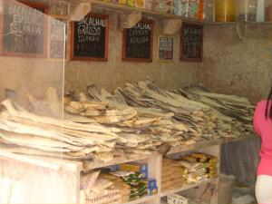 左:ポルトガルで有名な食材、バカリャウ(干し鱈)屋さんです。 左下:デパートの最上階のバルコニー(喫煙所&カフェ)からみえたサンタ・ジュスタのエレベーター 右下:お!セガフレード発見! |