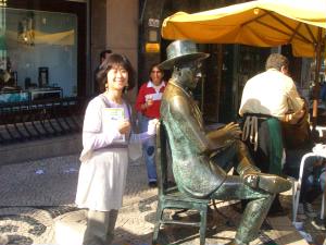 かつて芸術家や知識人たちが集まった老舗カフェのア・ブラジレイラ。その前にある有名な像。ポルトガルの有名な詩人フェルナンド・ペソア氏の座像です。 |