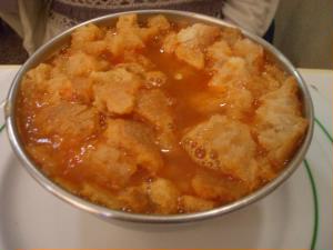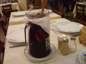 夕飯はランチのお店の向かいのレストラン。ほかの人の旅行記に載っていたお店です。 サングリアをオーダー。大きなオレンジがたくさん入っていて美味しそう♪ 前菜とパンはさげてもらい、スープをオーダー。クレム・デ・マリシュコ(魚介類のスープ)。魚のだしが効いていて、大きなクルトンがおいしいんです! |