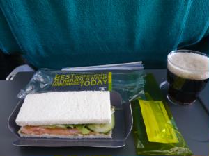 左:トイレの手を乾かす機械がダイソンでした。 すごい吸引力!? 左下:ウィーンまでに軽食(サンドイッチ)が出ました。スモークサーモンときゅうりで美味しい! 右下:14:00 OS51便 ウィーン発ー成田行き |