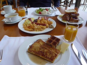 2月13日(土曜日) ブセナテラスの朝食ビュッフェ♪和食のコース、洋食のコースも選べますが、好きな量で食べたいので、ビュッフェを選択しました。 左:フレンチトーストとワッフルを焼いてもらいました。 美味しい♪ 下:バリエーション豊かな洋食ビュッフェです(^^) |