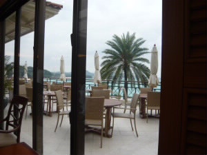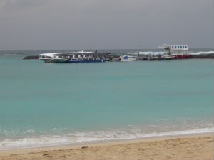 左:昨日は小雨が降ったり止んだりでしたが、今日は大丈夫そうです。きっと夏は外席で食べても気持ちいいんだろうな〜。 左下:食後にビーチをお散歩!くじら型のグラスボトムボートが停泊中〜。 右下:ビーチからのホテルの景色。 |