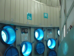 左:ホテルの先に海中展望塔があります。 左下:風が強いので、ちょっと寒いです 右下:海中展望塔は螺旋階段をぐるぐる降ります。すると、たくさん窓があって、360度、海を覗けるのです。 |
