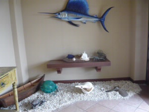左:水族館のように魚がたくさ〜ん、見えます。 “リアル海”なのに、すごい! 左下:海中展望塔の近くにある海近くのレストラン。夏のシーズンだけオープンしているようで今はやっていません。 右下:レストランのエントランスのディスプレイ |