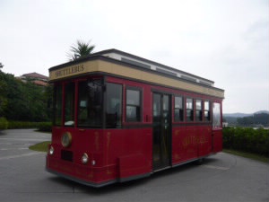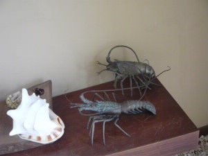 左:鉄で作った伊勢海老のオブジェ♪ 左下:ホテルの敷地内の足元ランプはふくろうです(^^)v 右下:敷地内を走るバス。可愛いです♪ |