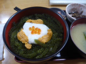 そしてランチは「元祖海ぶどう丼♪」 左下:た〜っぷりの海ぶどうに、とろろとウニが乗っています♪混ぜて食べるのですが、私としては混ぜないほうが好きかも・・・。 右下:沖縄料理、最高だわ〜(^^)v |