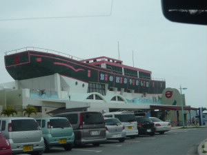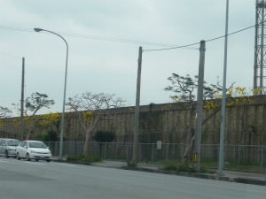 左:復元等はなく跡だけなので、とても味がある風情です。 左下:しばらく南下すると、右手にず〜っと続く壁。 これはは嘉手納基地です。 右下:基地の向かいにあった、道の駅「かでな」に寄りました。 道の駅の屋上から嘉手納基地が見えます。 土曜日のこの日も、飛行機が離着陸していました。 |