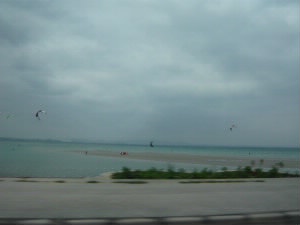 左:意外に早く南下したので、東海岸に行きました。 両側が海になっている橋を渡ります! 左下:まっすぐ〜。 右下:「道の駅」ならぬ「海の駅」がありました。 |