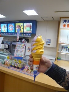 BLUE SEALアイスはカップのものをたまに東京でも食べるので、今回は、マンゴーと紫芋のコンビのソフトクリーム。 |