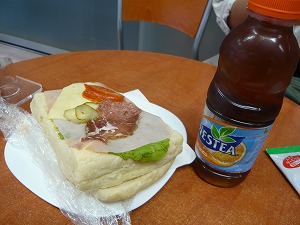 7月14日(土曜日) 朝食を食べ、ホテルの前からトラムに乗って 中央バスターミナルへ。 10時のバスでザグレブ空港に向かいました。 この移動はもうプロですw 日本まで荷物を預け、チェックイン。 12:45のフライトで、ちょっとお腹がすいたので パニーニとネスティ。 |