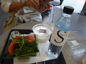 お惣菜やさん的な感じで、 その場で食べることもできます。 ブロッコリーとトマトのサラダとビシソワーズと水をゲット♪ 食べ終わってから気づいたのですが、その上の階に、カフェテリア形式のレストランがありました(^^;;; |