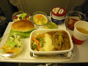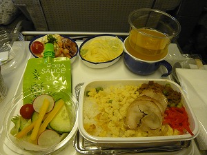 19:30パリ発 AF280便ですが、JALとの共同就航。 しかもJAL機体・・・。 左:ということはシャンパンはありません。(T。T) 左下:私はチキンを選択。いつもの茶そばではなく、 そうめんでした。しかも、そばつゆがパウチで 進化していました。 右下:旦那様はビーフです。 |