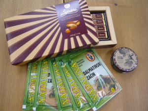チーズ講習会の時に参加者のみなさんにお渡しした KRASチョコとダルメシア産のハーブ。 |