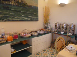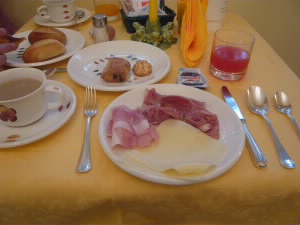 4月29日(月曜日・祝) 朝食です。 たくさんの甘いパンと生ハムとチーズ!大満足。このホテルに4泊にしてよかった♪ |