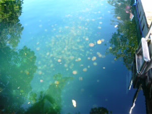 大昔の地殻変動により、四方をロックアイランドに囲まれて出来上がった塩水湖の1つ。 ここのくらげは毒性が極めて少ないので触っても大丈夫。 ジェリーフィッシュを堪能して、ホテルに戻ります。今朝見たホテルの桟橋につけてくれました。 |