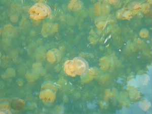 そして憧れのジェリーフィッシュレイク。世界遺産を守るために入場するのに100ドルかかります。桟橋を降り、山道を20分ほど歩くと・・・ 左:右側のステップで中に入るのですが、こんなに入り口までくらげが来てることはとても珍しいのだそうです。パラオに3年住んでいる添乗員さんも驚いてました。 すごいすごい!すごい量なの!!!ポワンポワンでかわいい♪♪♪ |