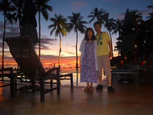 ホテルの池で、ウミガメやエイを飼育していて、朝と夕方に餌付けをしています。おお!エイが3匹いるよ。 右下:そして、夕焼けの時間です。 |