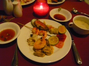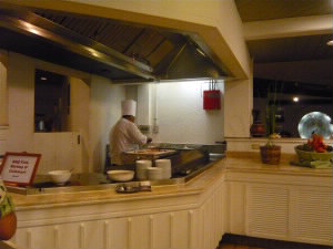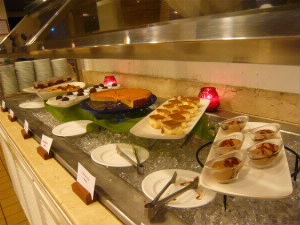 朝食を食べたメインダイニングでは、毎晩テーマを決めたビュッフェディナーをおこなっています。 金曜日はシーフードディナー。$39/人 |