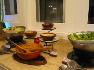 左:朝、卵料理やワッフルを焼いてくれるコーナーはBBQコーナーになっていました。 左下:シーザーサラダを自分で作るコーナーがありましたよ。すごい! 右下:デザートもたくさん♪ |
