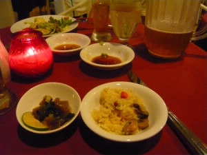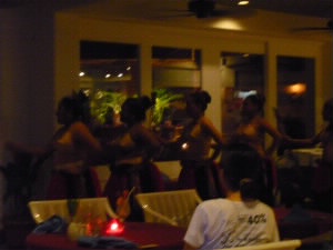 左:海老のBBQ、焼きムール貝、海老と貝のクリーム煮、お刺身など。 左下:パエリア、かつおのたたき!ビールはグラスだと$5だけど、ピッチャーなら$16でお得です。 右下:金曜日はパラオ人女性による伝統的なダンスショー! |