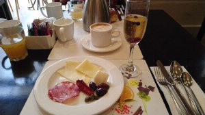 スパークリングワインもありますよ♪ 苺がなかったのでヨーグルトトッピング用のBOSCO(クランベリーやブラックカラント)を入れました。 チーズは、ハードが3種。エメンタールとエダムかな?あと白いからシェーブルですね。ドライトマトもブラックオリーブもケッパーもかなり塩味が強いです。 |