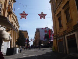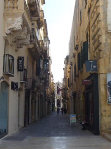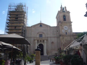 左:はちみつ色の町並みを歩きます。 左下:メインのリパブリック通りは、昨夜のお祭り騒ぎの通り。 ヴァレッタのサッカーチームのリーグ優勝を祝う飾りつけと、大きなユニフォームが壁に! 右下:聖ヨハネ大聖堂 |