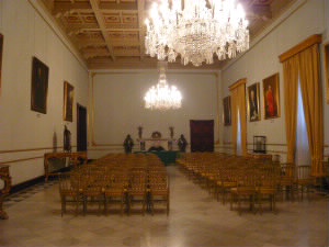 左:騎士団の会議室の壁の上部にも、マルタ騎士団の歴史が絵で描かれています。 左下:騎士団長の席。マルタ国旗が描かれています。 右下:こちらの部屋には歴代の騎士団長の肖像画が並んでいます。 |