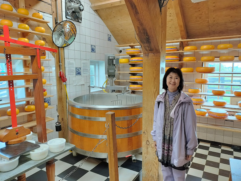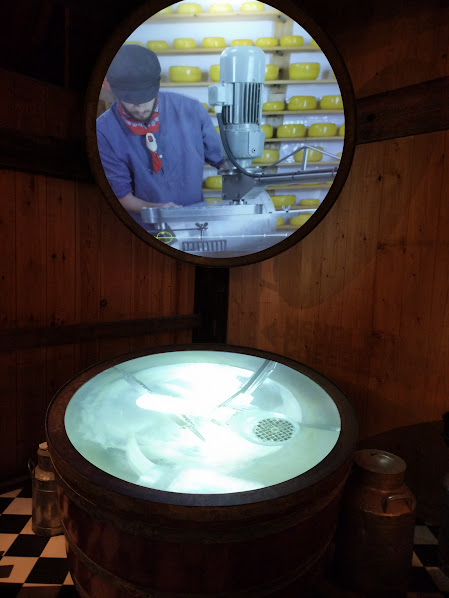 チーズ工房に行ってみましょう。 左:大きなチーズバットとプレス機 左下:チーズは全部模型です。棚で熟成させている様子です。 右下:正面とチーズバットの中、2面から見た製造方法の画像が解りやすかったです。 |