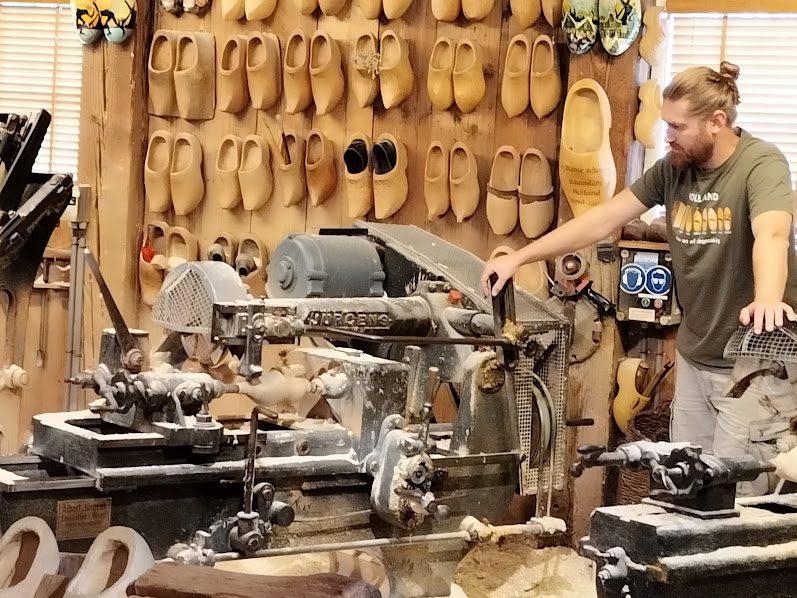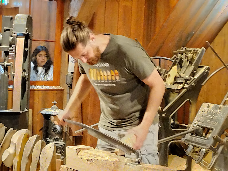 左:チーズ模様や、ローラースケート仕様など面白い!!! 左下:木靴製造の実演です。まず、全体の形を作ります。 右下:中をくりぬきます。 |