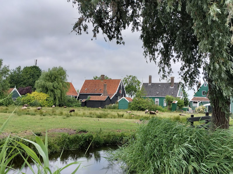 6月19日(月曜日) オランダの「オランダ村」w ザーンセ・スカンスに行きました。アムステルダム中央駅から4駅のところにありますが、既に1駅きたところのホテルに滞在しているので3駅で行けました。 ここは田園の中にある風車村。各地から集められた7基の風車があるテーマパークです。 |