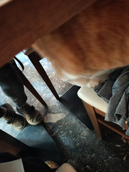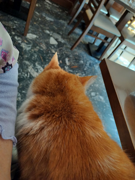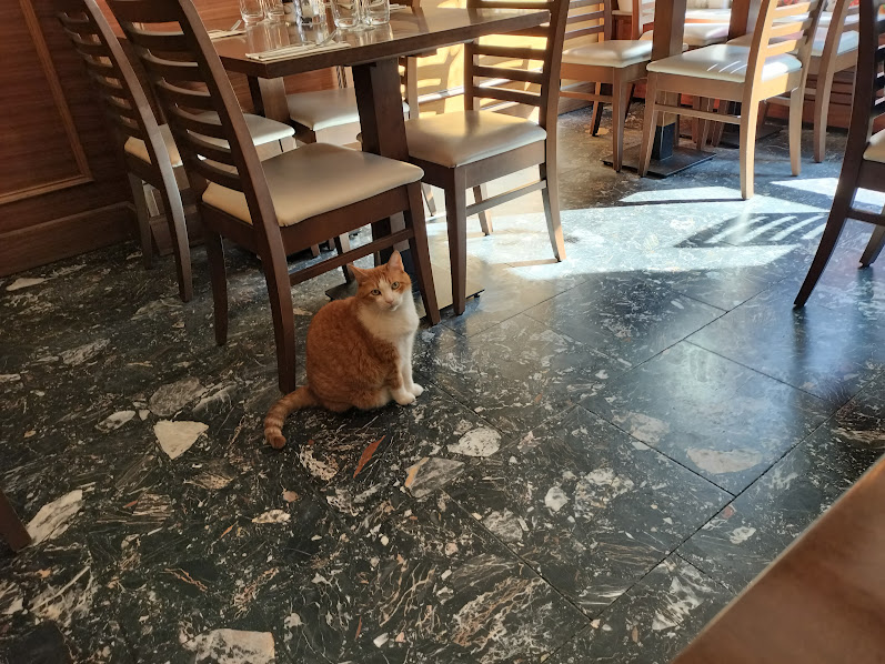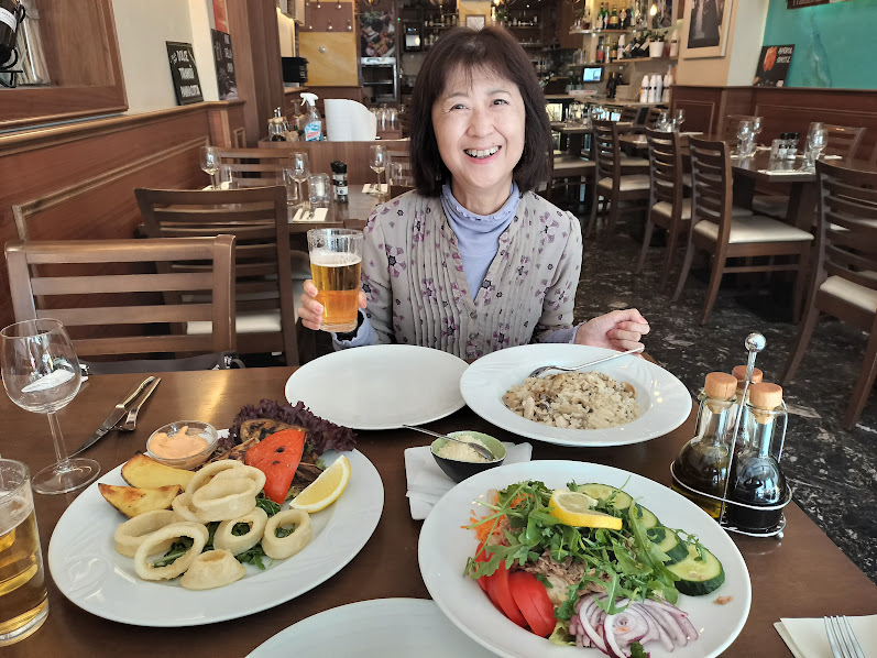 夕食はイタリアン。美人なとらねこちゃんがゆっくり歩いてきて、私の膝に乗り・・・(^^;;;; でも、あげないよ。2人で59.5ユーロでした。 |