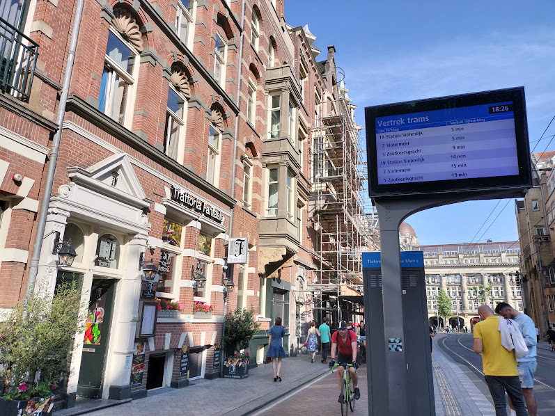写真左側がレストラン「ファンタジア」の入り口。ホテルからは離れていますが、19番のトラム1本で行くことができ、トラム停が目の前という便利さ。 トラムは何番のトラムが何分後に来るかがリアルタイムに表示され、本当に便利です。 この明るさで18時。ちなみに日の入りは21時です。 |