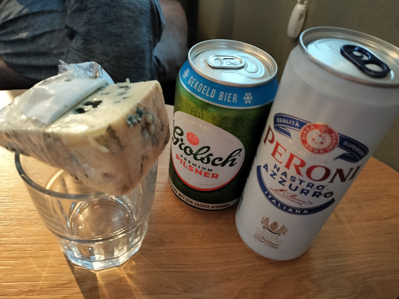 ホテルに戻って、ビールとブルードーベルニュ! ホテルの近所のコンビニSPARでブルードーベルニュが100g200円くらい。安すぎる!!! |