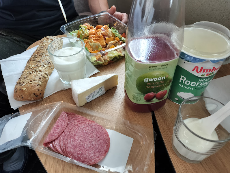 6月20日(火曜日) アムステルダムの3泊のみ、朝食は付けませんでした。朝食付きだと宿泊費がかなり高くなったので(^^;;;; そこで、近所のコンビニSPARで、ハム、ジュース、ヨーグルト、チーズ、サラダ、パンを購入していました。朝6時から開店していて、焼きたてのパンが30種類くらい並びます。結構いい♪ |