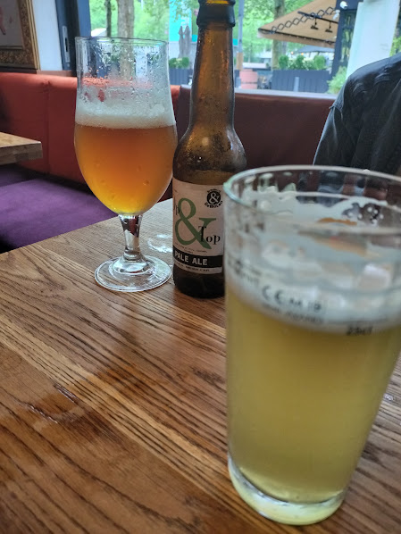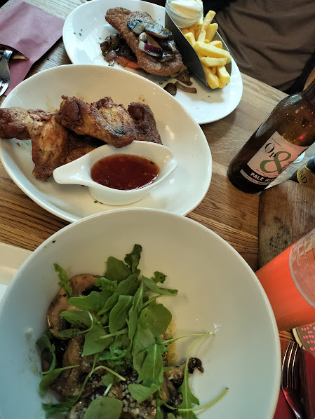 夕食は市庁舎近くのレストラン街のビール&ステーキハウス。 左:ビールの種類もたくさんありました。 左下:カトラリーセット、このパターンによく出会いました。ナイフとフォーク、下に紙ナプキンが入っています。 右下:マッシュルームのサラダ、チキンウイング、ステーキ。 2人で43.95ユーロでした。 |