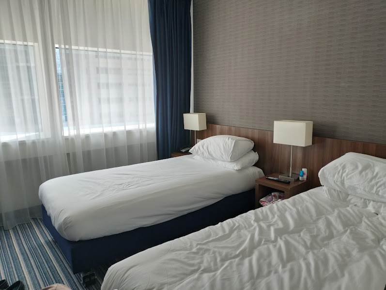 ホテルに戻ってチェックイン。 ホリデーイン・ロッテルダムに4泊します。ヨーロッパでよく見る、この細長いベッド。 |