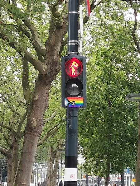 ホテルからトラムで1駅いくと市庁舎があります。かっこいい。 市庁舎前の歩行者用信号。 旗を振っています。何だろう?信号の下にレインボーのシールが貼ってあるから、LGBTQかな? |