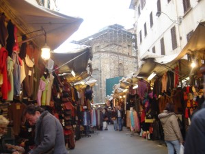Aメルカートチェントラーレの前からずっと露天のテントが続きます。革のコート、手袋、アクセサリー、パシュミナ、マフラー、セーター、カレンダーなど、衣類やお土産ものやさんがずら〜っと並びます。