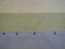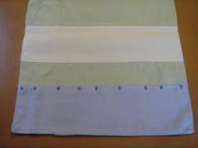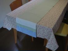 無地ベースのテーブルランナー。中央の長い部分は薄い緑、そして生成り色、同じ緑色、淡いブルーのランナーで両脇にブルーのビーズが付いています。柄物のクロスの上に掛けるとアクセントになってコーディネートが冴えますよ!