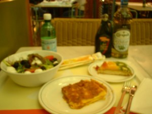 空港に着いて呆然。 いきなり5時間遅れの文字が。。。Σ( ̄□ ̄;) 往きといい、帰りといいまったく。。。 ということで、アリタリア航空からランチ無料券が配布されました。なんと昨夜夕飯を食べたCioaが空港内にもあり、そこで、何をたべてもOKとのこと。 ←人のお金だと思うと、よく食べます(笑) グリッシーニ、サラダ、ラザニアにドルチェまで(爆) |