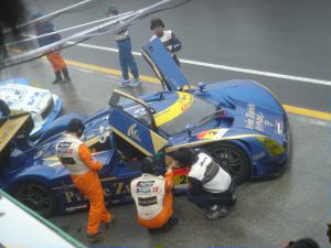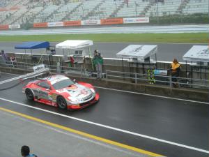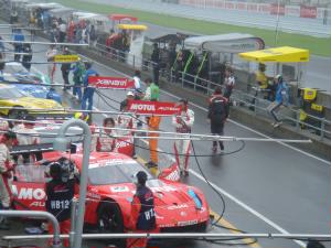 霧雨の天気です。 今回は、ピットやスターティンググリットにも入れるチケットだったので、ピット上へ。 私はSC派だったのですが、トヨタ系ピットの上は控え室で行けませんでした(号泣) |