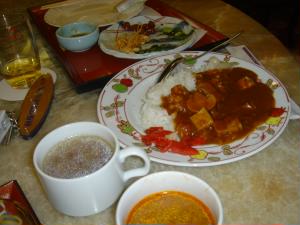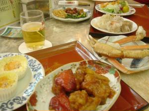 宿泊は近くの秋保温泉。秋保グランドホテル。 夕飯はビュッフェ(^^)v アンティパスタ(前菜)に、ローストビーフやお刺身、ばい貝、中華サラダ。 プリモに、海老グラタン、かに、点心、油淋鶏。 セコンドに焼きそば、そうめん、焼きおにぎり、うなぎの蒲焼。旦那様はカレー?(笑) |