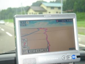 レンタカーはナビ付き。 仙台駅からサーキットまで40分ほど。 カーナビの画面が・・・周りに目印がないので、砂漠を走っているかのよう(^^;; |