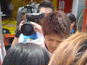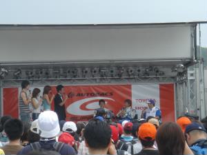 イベント広場ではTV東京の激走GTの公開収録中。 司会はモンキッキー。インタビューに答えているのは織戸選手、片岡選手と・・・真ん中は誰?(^^; |