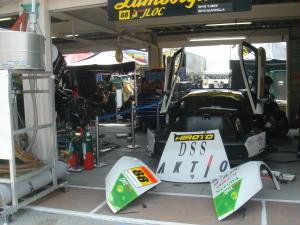 決勝スタート!8位スタートの6号車、片岡選手のドライビングを見守るテントの中の章選手 |