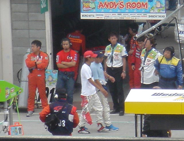 スターティンググリッドにスタートドライバーを残しピットに仲良く戻ってくる寿一くんと章くん。どこにいるかわかる?中央あたりです。 写真をクリックすると大きくなります。 このふたり、並んで歩くとデカイ。。。(笑) |