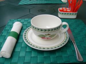 4月30日(日曜) 朝食です。 可愛らしい椅子と内装のダイニング。 でも、気持ちがよさそうなので、ガゼボがあるお庭で食べました。 席にはビレロイ&ボッホのカップ&ソーサー(食器もすべてそうでした)。全体がしつこくない、上品に可愛らしいコーディネートです。 ちなみにお砂糖はセガフレッドでした。(笑) |