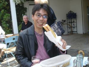 フランスパン大好きな旦那様はサーモンの1本サンドイッチ。かなり嬉しそうです。 日本ではカトラリー入れのような長いバスケットにど〜んと入ってきました。 |