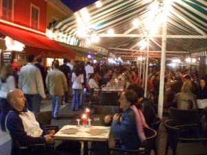 で、19時になったので、夕飯に出かけました。 さっきの朝市の通りの両側はレストラン! なんと、市場だった中央にテントの下に、その向かいのレストランがテーブルと椅子を出して席が!! あったまいい〜♪テントの下は14時まで朝市で、その後はレストランの外席なんだ! |